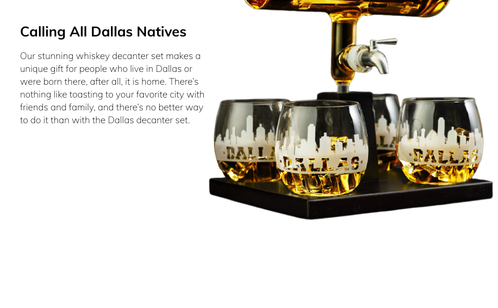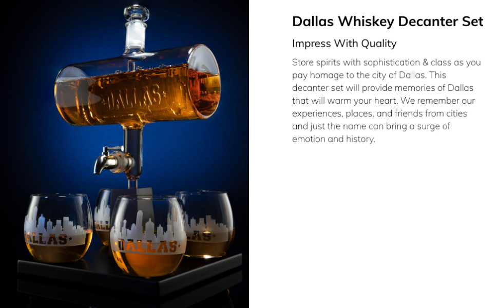 Amazon Com Dallas Whiskey Decanter Dispenser And 4 Liquor Glasses Whisky Decanter Glass Set Dallas Themed Gift City Themed Gift Texas Decanter Set Cowboys For Men Dallas Texas